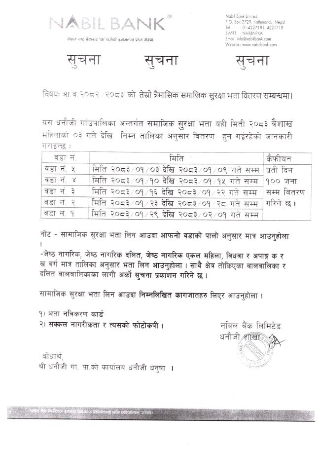 आ.व.२०८२/०८३ को तेस्रो त्रैमासिक सामाजिक सुरक्षा भत्ता वितरण सम्बन्धि सूचना |